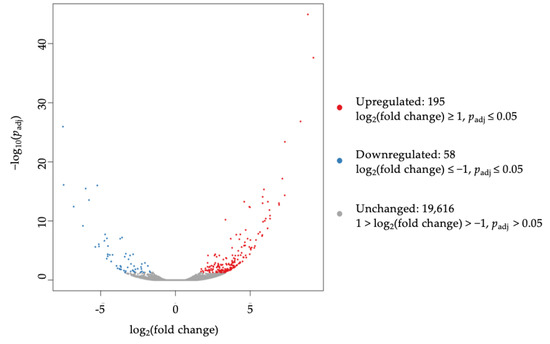 Volcano plot of differentially expressed genes (DEGs) between sensitive and non-sensitive colorectal cancer (CRC) cell lines. The x-axis represents the distribution of the log2 of the fold change, and the y-axis represents the −log10 of the adjusted p-value (padj). Upregulated genes are shown in red, and downregulated genes are shown in blue.
