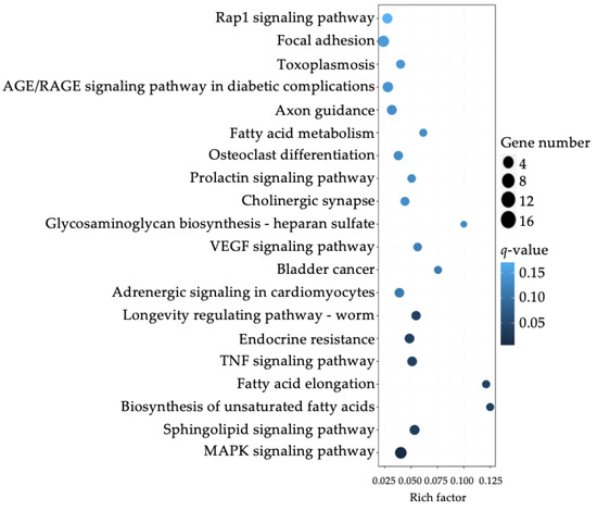 The 20 most enriched Kyoto Encyclopedia of Genes and Genomes (KEGG) pathways. Rich factor refers to the ratio of the number of enriched differentially expressed genes (DEGs) in the KEGG category to the total genes in that category. The larger the Rich factor, the greater the degree of enrichment. (AGE/RAGE = advanced glycation end-products/receptor for advanced glycation end-products. VEGF = vascular endothelial growth factor. TNF = tumor necrosis factor. MAPK = mitogen-activated protein kinase.)
