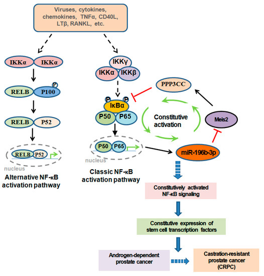 Inflammatory signaling in both PCa cells and the TME plays crucial roles throughout every event of this reaction chain. NF-κB transcription factors, the key regulators of inflammatory signaling, play important roles in both the emergence and maintenance of CRPC. Currently, most NF-κB inhibitors are designed to target either NF-κB itself or the components of traditional NF-κB activation pathways (Figure 2). It should be noted that there are differences between NF-κB activation in acute immune responses and NF-κB constitutive activation in tumor cells, and there are differences between the activation of NF-κB pathways and the activation of NF-κB itself [22,23] (Figure 1). Our studies suggest that the constitutive activation of NF-κB in tumor cells is different from NF-κB acute activation in immune cells, and the constitutive activation of NF-κB in tumor cells does not depend on traditional NF-κB pathways, which are normally related to the activation of the IKKβ or IKK complex (Figure 1) [13,22]. This can explain why IKKβ/IKK inhibitors are not as powerful for the inhibition of tumor cell proliferation and tumor growth as was expected that they theoretically should do. Targeting the non-IκBα/NF-κB(p65) components in the constitutive NF-κB signaling circuit, including miR-196b-3p, Meis2, and PPP3CC, not only inhibits the constitutive NF-κB activation specifically in CRPC cells but also avoids the side effects by the indiscriminate inhibition of NF-κB in normal cells (Figure 1). Therefore, any strategies, particularly small-molecule inhibitors or activators, that target non-IκBα/NF-κB(p65) components in the constitutive NF-κB signaling circuit would be highly desirable.