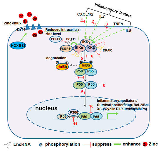 In addition, it has been reported that high mobility group box 1 protein (HMGB1) activates the NF-κB signaling pathway via interaction with and binding to TNFR1 in CRPC cells [29]. NAD(P)H:quinone oxidoreductase 1 (NQO1) links redox homeostasis with inflammatory signaling in PCa cells. NQO1 inhibition can reinforce survival signaling under conditions of androgen deprivation by promoting interactions between NF-κB and p300, which increase the accumulation of nuclear IKKα and NF-κB while decreasing the expression of p53 protein [30]. HOXB13 is overexpressed in CRPC cells and promotes CRPC cell invasion and metastasis. The overexpressed HOXB13 upregulates Znt4, a zinc efflux channel, to reduce intracellular zinc concentrations, which then stimulates IKKα expression and IκBα degradation to enhance the nuclear translocation of RelA/p65 in PCa cells (Figure 2) [31,32].