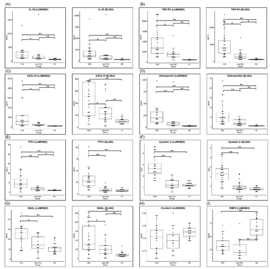 Schematic workflow of the serum biomarker analyses is also shown in Figure 4. In the screening phase, serum IL-18, TNF-R1, CXCL10, osteopontin, TFF3, clusterin, cystatin C, RBP4, and NGAL concentrations were measured in 55 samples (VIKI group, n = 20; non-VIKI group, n = 15; HC, n = 20). They were analyzed using the Bio-Plex® MAGPIX™ multiplex reader (Bio-Rad Laboratories Inc., Hercules, CA, USA) based on Luminex technology with Human Magnetic Luminex Performance Assay Base Kit, Kidney Biomarker Panel (R&D Systems, Inc., Minneapolis, MN, USA) for CXCL10, osteopontin, TFF3, clusterin, cystatin C, and RBP4 and with the Human Luminex Discovery Assay (R&D Systems, Inc., Minneapolis, MN, USA) for IL-18, TNF-R1, and NGAL. Calibration curves were constructed using Bio-Plex Manager 6.1 (R&D Systems, Inc., Minneapolis, MN, USA).