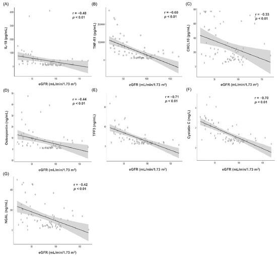 Consistent results were observed in the screening test (Supplementary Figure S1). Cystatin C (r = −0.84, p < 0.001) and showed strong negative correlation with eGFR, while TFF3 (r = −0.64, p < 0.001) and TNF-R1 (r = −0.52, p < 0.001) showed moderate negative correlation. CXCL10 (r = −0.36, p = 0.007), osteopontin (r = −0.47, p < 0.001), NGAL (r = −0.44, p < 0.001), and IL-18 (r = −0.41, p = 0.002) showed weak, negative correlation with eGFR; however, RBP4 and clusterin failed to demonstrate significant correlation with eGFR.