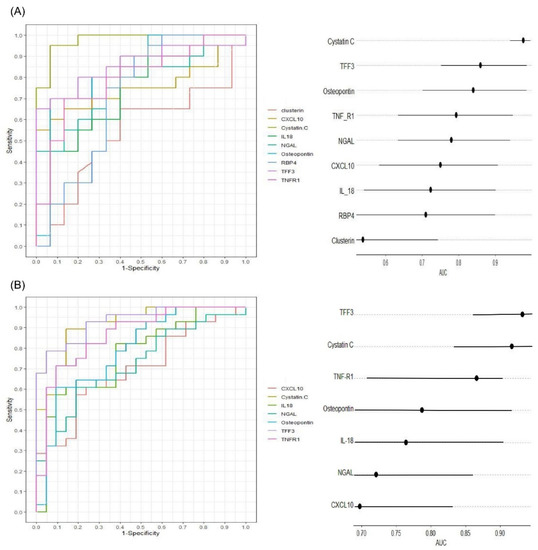 Diagnostic performance of the serum biomarker concentration measured by Luminex assay ((A), n = 35) and ELISA ((B), n = 49) for vancomycin-induced kidney injury (VIKI) in subjects receiving vancomycin (non-VIKI and VIKI group). Receiver operating characteristic curves (left) and horizontal dot plot of area under curve (right) are shown. In the horizontal dot plot, the dot and line represent the area under curve and its 95% confidence interval, respectively. Abbreviations: TFF3, trefoil factor-3; IL-18, interleukin-18; TNF-R1, tumor necrosis factor receptor 1; NGAL, neutrophil gelatinase-associated lipocalin; CXCL10, C-X-C motif chemokine ligand 10; RBP4, retinol binding protein 4; AUC, area under curve.