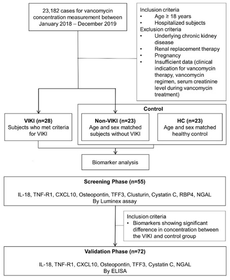 Study design and subject selection are summarized in Figure 4. The current study included subjects from our previous study cohort [66]. In brief, 23,182 cases referred for vancomycin concentration measurement from January 2018 to December 2019 were screened. Among adult (age ≥ 18 years) hospitalized patients who received intravenous infusion of vancomycin, those who had at least one steady-stage vancomycin trough concentration, and sCr measurement during vancomycin therapy were included. Patients with chronic kidney disease, patients on renal replacement therapy, pregnant patients, and patients with insufficient data (vancomycin regimen, the use and type of concomitant nephrotoxic agent use, clinical indication for vancomycin therapy, sCr during vancomycin therapy) were excluded. Among these patients, those who developed VIKI were included in the VIKI group, and age- and sex- matched patients who did not develop VIKI were included in the non-VIKI group. VIKI was defined as a minimum of two consecutive documented increases in sCr (defined as an increase of 0.3 mg/dL or ≥50% increase from baseline, whichever was greater) after the start of vancomycin therapy and the exclusion of any other possible documented cause for acute kidney injury [8]. The age- and sex- matched control group consisted of two subgroups, the non-VIKI group and healthy control (HC). HC consisted of healthy subjects referred for routine health examination without abnormal medical findings.