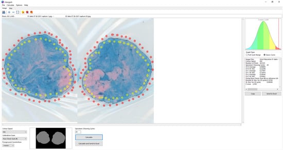 Analysis of flattened two-color chewing gum with ViewGum software (dHAL Software, Kifissia, Greece, http://www.dhal.com/viewgum.htm (accessed on 25 October 2021)) after performing the Hue-check View Gum® Test (Orophys, Bern, Switzerland).