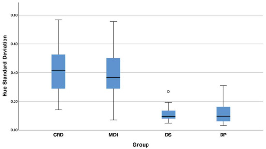 Boxplot of the mean VOH in 4 different groups: (CRD) complete removable denture maxilla/dentate mandible; (MDI) mini dental implant overdenture maxilla/dentate mandible; (DS) dental students; (DP) dentate subjects.