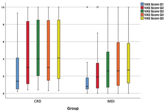 Mean VAS score outcome for masticating food with different con-sistencies (Q1 blue bar: soft white bread; Q2 red bar: hard cheese; Q3 green bar: hard sausage; Q4 orange bar: apple; Q5 yellow bar: carrot) comparing CRD with MDI group. There were no significant differences in the VAS score between both groups (p > 0.05). *: Outlier.