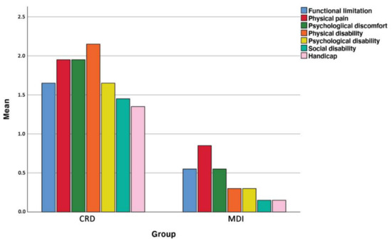 OHIP-14 outcome in different domains in CRD and MDI group. Significant differences were noted for psychological discomfort (dark green), physical disability (orange) and social disability (light green).