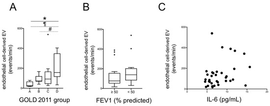Total EEV according to 2011 GOLD group (A) and to FEV1 (B) (*: p < 0.001 for trend; ¶ and #: p < 0.05 for group D versus group A and B, respectively; Jonckheere–Terpstra test). Correlation between total EEV and plasma IL-6 (C). EEV: endothelial-derived extracellular vesicles; FEV1: Forced Expiratory Volume in the 1st second; IL-6: interleukin-6.