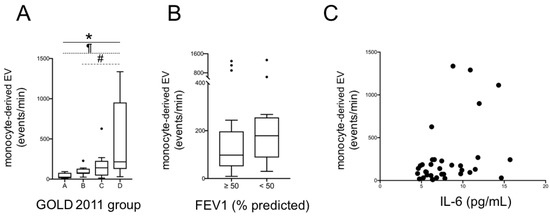 Total MEV according to 2011 GOLD group (A) and to FEV1 (B) (*: p < 0.001 for trend; ¶ and #: p < 0.05 for group D versus group A and B, respectively; Jonckheere–Terpstra test). Correlation between total MEV and plasma IL-6 (C). MEV: monocyte-derived extracellular vesicles; FEV1: Forced Expiratory Volume in the 1st second; IL-6: interleukin-6.