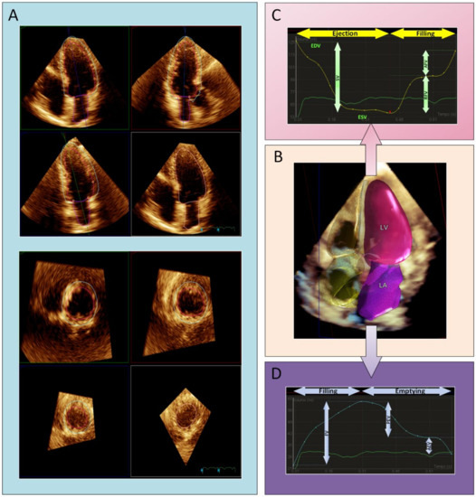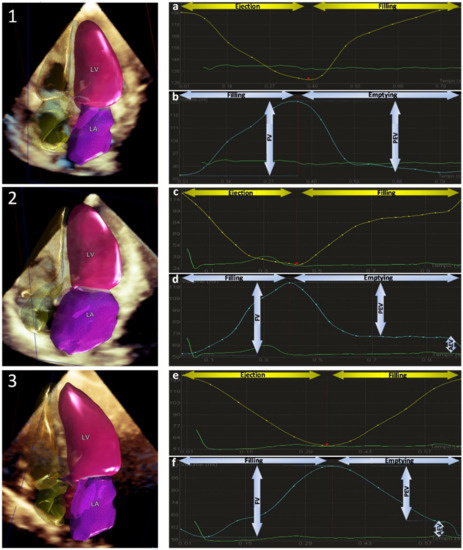 - Zeidan, Z.; Erbel, R.; Barkhausen, J.; Hunold, P.; Bartel, T.; Buck, T. Analysis of global systolic and diastolic left ventricular performance using volume-time curves by real-time three-dimensional echocardiography. J. Am. Soc. Echocardiogr. 2003, 16, 29–37. [Google Scholar] [CrossRef]