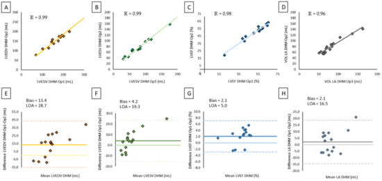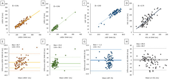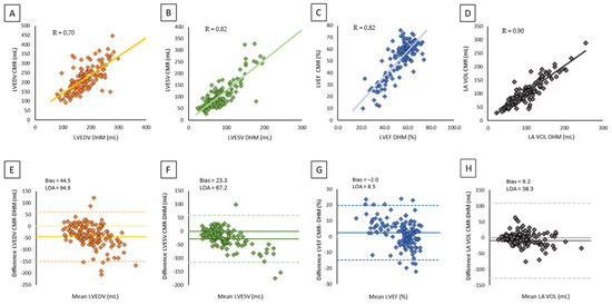 Correlation and agreement between CMR and DHM on left chamber volumes and LV function: (A) scatter plot of LVEDV by CMR versus DHM, (B) scatter plot of LVESV by CMR versus DHM, (C) scatter plot of LVEF by CMR versus DHM, (D) scatter plot of LA volume by CMR versus DHM, (E) Bland–Altman plot of LVEDV by CMR versus DHM, (F) Bland–Altman plot of LVESV by CMR versus DHM, (G) Bland–Altman plot of LVEF by CMR versus DHM, (H) Bland–Altman plot of LA volume by CMR versus DHM.