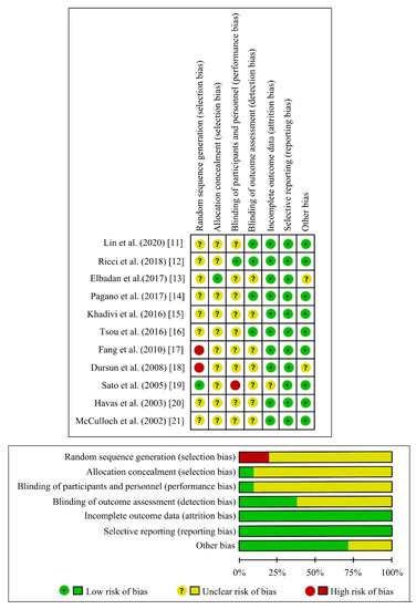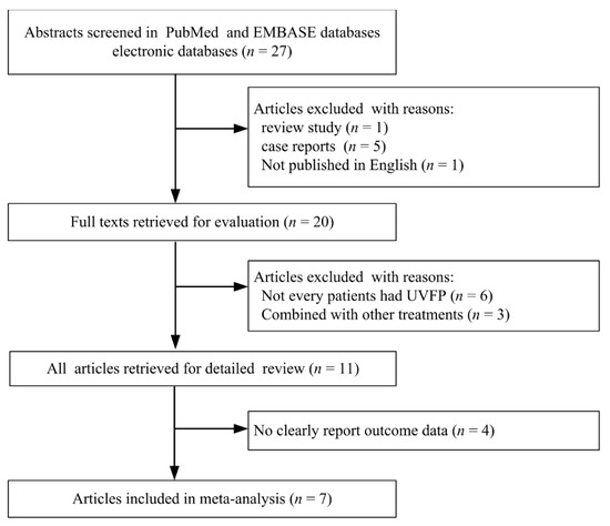 Twenty-seven articles about autologous fat injection laryngoplasty on UVFP were searched from two electronic databases. Following reviews with the two investigators, 20 articles were included as the study selection criteria (Figure 1). One review study, five case reports, and one non-English article were excluded. The full texts of 20 included articles were reviewed again. However, nine of them were excluded because not all patients had UVFP and fat injection laryngoplasty combined with other treatments. Eleven clinical studies about autologous fat injection laryngoplasty for UVFP were reviewed [11,12,13,14,15,16,17,18,19,20,21], and the risk of bias for all articles is summarized in Figure 2. Finally, seven studies were suitable for meta-analysis.