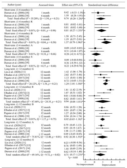 For the perceptual outcome grading GRBAS (Figure 3), the results of meta-analyses revealed that pooled SMD were statistically significant in G (total SMD = 0.74; 95% CI = 0.20~1.28; p < 0.05), R (total SMD = 0.74; 95% CI = 0.20~1.28; p < 0.05), and B (total SMD = 0.74; 95% CI = 0.20~1.28; p < 0.05) at ≤6 month. The statistically significant in G (total SMD = 1.29; 95% CI = 1.01~1.58; p < 0.05), R (total SMD = 0.94; 95% CI = 0.08~1.81; p < 0.05), B (total SMD = 0.92; 95% CI = 0.65~1.18; p < 0.05), A (total SMD = 0.92; 95% CI = 0.30~1.55; p < 0.05), and S (total SMD = 0.71; 95% CI = 0.17~1.25; p < 0.05) were also noted at ≥12 months. The between-study heterogeneity ranged from I2 = 0.01% to I2 = 87.68% in the subgroup analysis. The short-term and long-term results suggested that AFIL have the improvement in the perceptual outcome.