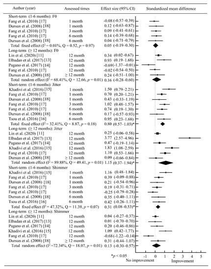 AFIL could be a permanent procedure because of harvesting viable adipose stem cells. There were still laryngologists believing that AFIL may be a permanent procedure for UVFP because of higher ASC harvested [40]. That is also a possible explanation as to why AFIL markedly decreased the need for laryngeal framework surgery [41]. In addition, autologous fat material is considered the ideal material. The ideal material is considered to meet the criteria of not causing tissue reactions such as tissue rejection or tissue inflammation. The sustained function to fill the tissue defects. Easy to harvest with reliable to use. In the literature review, the AFIL was widely accepted and the voice outcome is good [11,13,14,15,16,17,18]. The results of our reviewed articles supported that AFIL is a suitable phonosurgical treatment for UVFP. Our meta-analysis results revealed that MPT and jitter were significantly improved in short- and long-term effects after AFIL. The improvement in shimmer was only noted in the short-term result. However, no significant differences in F0 and NHR were foundin short- and long-term results. Elbadan et al. thought that AFIL could reduce the glottal gap size, reducing the flow rate and subglottic pressure [13]. Jitter is presented as the measurable frequency perturbation and an important parameter to assess the improvement in voice quality [11]. Shimmer, F0, and NHR also could reflect the vocal abnormalities and are the indicators of voice quality improvement [11]. This review answers which improvement is gained in subjective and objective voice quality after AFIL and the average duration of the effective outcomes for patients with UVFP. We conclude that AFIL helps with subjective and objective voice quality in short and long-term follow-up with no F0 and NHR changes.