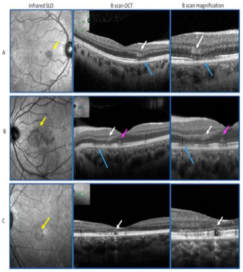 (A): “Classical” acute macular neuroretinopathy (AMN) with a petaloid, sharp border, lesion on infrared scanning laser ophthalmoscopy (SLO) (yellow arrow), corresponding to an outer plexiform layer (OPL) hyper-reflectivity on optical coherence tomography (OCT) (Heidelberg Engineering, V1.10.12.0, 69115 Heidelberg, Germany) B-scan (white arrows), and with extrafoveal ellipsoid zone (EZ) disruption (blue arrows). (B): AMN “plus” with “photoreceptoritis” with a petaloid, fluffy border, lesion on infrared SLO (yellow arrow) corresponding to OCT B-scan OPL hyper-reflectivity (white arrows), and EZ disruption observed in the foveal center (pink arrows). (C): AMN “plus” with “photoreceptoritis” and “retinal pigment epithelitis”: infrared SLO lesion (yellow arrow) with retinal pigment epithelium (RPE) atrophy on OCT B-scan (white arrows).