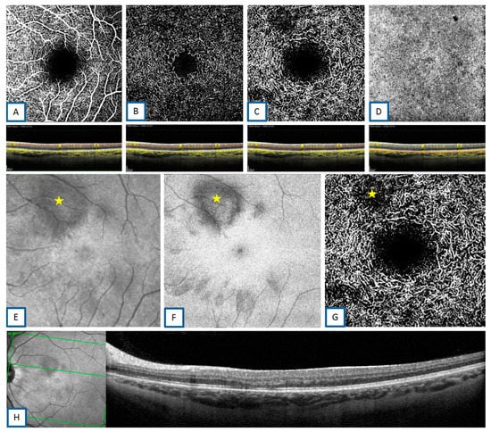 (A): Optical coherence tomography angiography (OCTA) (Heidelberg Engineering, V1.10.12.0, 69115 Heidelberg, Germany) superficial capillary plexus “en-face” and B-scans showing normal flow. (B): OCTA intermediate capillary plexus “en-face” and B-scans showing normal flow. (C): OCTA deep capillary plexus “en-face” and B-scans showing areas of reduced flow in the areas of infrared scanning laser ophthalmoscopy (SLO) hyporeflectivity. (D): OCTA choriocapillary “en-face” and B-scans showing normal flow. (E–G): AMN infrared SLO hyporeflectivity, ellipsoid lesion, and area of reduced flow, respectively, detected on infrared SLO, “en-face” spectral domain (SD)-OCT, and deep capillary plexus OCTA (yellow stars). The area of deep capillary flow reduction on OCTA is smaller than the area of hyporeflectivity seen on infrared SLO images. (H): SD-OCT B-scan of the corresponding AMN lesion.