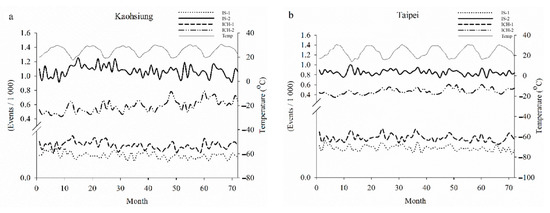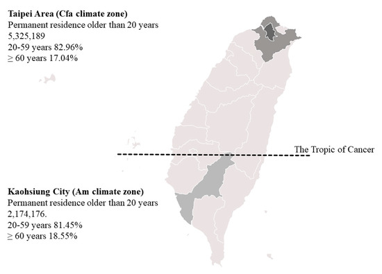 Taipei, New Taipei, and Kaohsiung are big cities in Taiwan. The first two cities are located in the subtropical region, and the latter is in the tropical region. Taipei and New Taipei are close together, and more than six million people live and work there. It is not easy to identify patients’ residence using a hospital-based claim data in a disease incidence study. Therefore, we used the Taipei Area, including Taipei City and New Taipei City, to estimate the occurrence of stroke in the subtropical area in this study. Kaohsiung City is the biggest city in this region, with a population of 2.7 million. We used this city to study stroke onset in a tropical area (Figure 1). Although the distance from Kaohsiung City to the Taipei Area is only 350 km, the climates are quite different between these areas. Kaohsiung City is located in an Am (tropical, monsoon) zone, and the Taipei Area is a Cfa (temperate, no dry season, hot summer) zone, according to Köppen–Geiger climate classification [29].