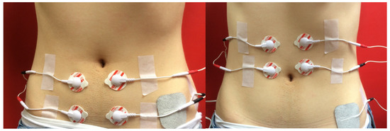 Subsequently, surface electromyography (sEMG) of the rectus abdominis above and below the umbilicus was conducted using the MyoPlus 4 Pro electromyograph (Verity Medical Ltd., Romsey, UK), with the left and right sides of the abdomen measured separately. Two working electrodes were placed on each belly of the rectus abdominis, and a reference electrode was placed at the anterior superior iliac spine (Figure 1). Measurements were taken for resting activity, functional activity, and isometric contraction. The procedure was performed twice, first for the muscle section above the umbilicus, and then for the section below. The next stage was the application of KT tapes (K-Active Tape-a flexible, adhesive tape consisting of a cotton fabric and an acrylic adhesive layer; elasticity 130–140%, Nitto Denko K-Active® Tape, Nitto Denko Tape Materials Corporation Ltd., Osaka, Japan) in the intervention group, using the corrective (mechanical) technique with a 75–100% tension range. In the control group, non-stretch tapes were used (cloth surgical tape). The tapes were placed perpendicularly to the rectus abdominis in the form of 2.5 cm-wide strips along the entire length of the muscle, crossing the midline of the linea alba (Figure 2). The application period was 48 h. After that time, the tapes were removed and the measurements for the width of RAD and sEMG were repeated.