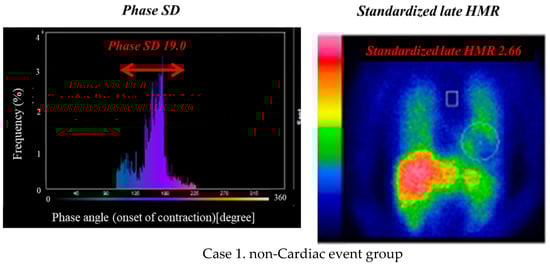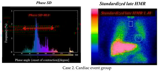 Phase histograms for measurements of phase SD (left panels) and heart/mediastinum ratio (HMR) of MIBG activity (right panels). Case 1: a 72-year-old female with ischemic cardiomyopathy who had reduced LVEF (32%), but had nearly normal values of LV mass index (97 g/m2), phase SD (19), and MIBG HMR (2.66). No cardiac event occurred during the follow-up period. Case 2: a 68-year-old male undergoing cardiac re-synchronization therapy who had non-ischemic cardiomyopathy with reduced LVEF (28%), increased LV mass index (178 g/m2), increased phase SD (40), and decreased MIBG HMR (1.48). He died of progressive pump failure during the follow-up period.