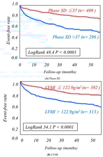 LVMD and left ventricular mass index (LVMI) as an index of LVH were evaluated using three-dimensional data derived from resting myocardial perfusion imaging (MPI) with 99mTc-tetrofosmin of 300 MBq, as shown by our previous study (Figure 1) [,,]. Briefly, MPI SPECT was performed using an ECG-gated approach with a frame rate of 16 and a single-head gamma camera equipped with a high-resolution, parallel-hole collimator. LVMD and LVMI were measured using three-dimensionally reconstructed ECG-gated data of serial 10- to 14-short-axis SPECT images with the Heart Function View software (HFV version 1.1;Nihon MediPhysics, Tokyo, Japan) [,] and Corridor 4DM version 6.0 software (INVIA Medical Imaging Solutions, Ann Arbor, MI, USA) [], respectively. LVMD was quantified as a standard deviation (SD) of phase angles (degrees) on a phase histogram (Figure 1). Phase angles at the initiation of systole were calculated mathematically by a high-ordered Fourier analysis of myocardial count changes (i.e., time−activity curve) in each pixel during a cardiac cycle, which is basically identical to a regional time−volume curve. The left ventricular mass was normalized as LVMI (g/m2) using body surface area.