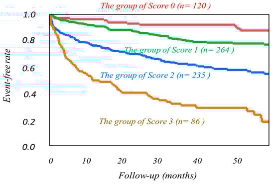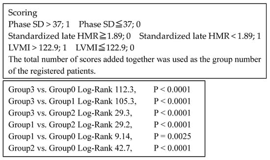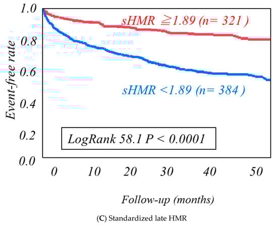 A statistical value is shown as mean ± 1 SD. Mean values were compared between the two groups using the unpaired t-test, and categorical variables were compared using the Chi-square test. The Kaplan−Meier analysis using the key parameters identified in this study was used to create a time-dependent, cumulative event-free curve, and the log-rank test was also used for comparison of the curves, if necessary. Following univariate analysis, multivariate analysis with a Cox hazard proportional model was performed using the statistically appropriate number of significant variables identified to calculate the hazard ratios and 95% confidence intervals (CIs). A receiver operating characteristic (ROC) analysis was performed to determine an optimal cutoff value of an independent significant parameter for differentiating a risk category. Global Chi-square values were calculated when incremental prognostic values were needed to be clarified, using several significant variables identified above. A computer software program, SAS for Windows, version 9.4 (SAS Institute, Cary, NC, USA), was used for these analyses. A p-value less than 0.05 was considered significant.
