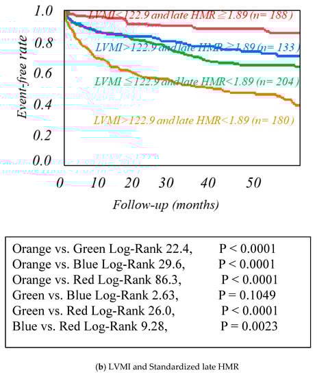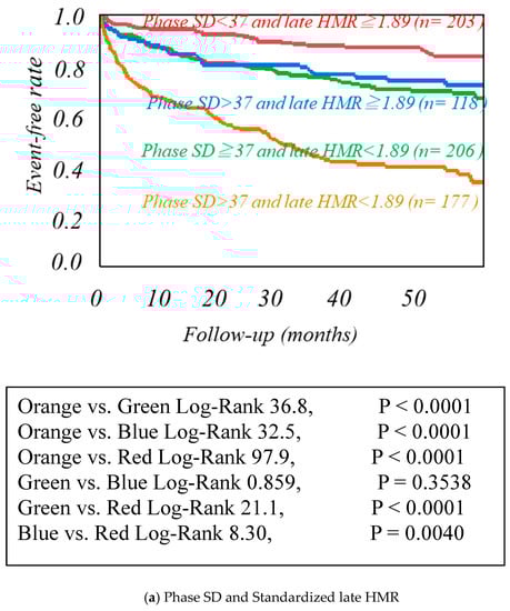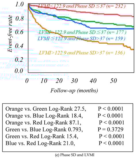 Kaplan−Meier event-free analysis of the combination of Phase SD and LVMI in three dimensions, standardized late HMR. Kaplan−Meier event-free curves created by the combinations of two of the three prognostic variables such as phase SD, left ventricular mass index (LVMI), and standardized MIBG heart/mediastinum ratio (HMR).