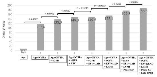 Additions of LVMI, phase SD, and MIBG HMR to the significant multivariate variables, including conventional clinical and cardiac functional biomarkers (Table 3), show significant increases in prognostic values, leading to a maximal Chi-square value of 188.8. Abbreviations are the same as those in Table 1 and Table 2.
