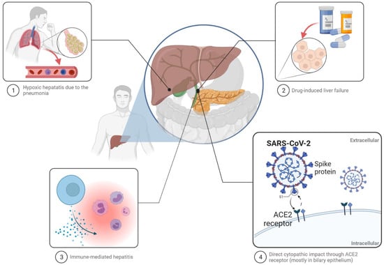 The pathogenesis of liver injury caused by SARS-CoV-2 is still unclear. Several possible mechanisms are taken under consideration: direct cytopathic effect of the virus through the ACE2 receptor, immune-mediated hepatitis as a result of uncontrolled inflammatory response following COVID-19 infection, leading to cytokine storm syndrome, anoxia as a cause of hypoxic hepatitis due to pneumonia and respiratory failure and drug-induced liver injury secondary to medications used for the treatment, among others, as well as antipyretic drugs or antiviral agents (Figure 1) [,,,].