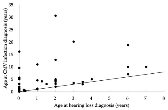 Relationship between age at hearing loss diagnosis and age at cytomegalovirus (CMV) infection diagnosis. The line indicates equal ages at hearing loss diagnosis and CMV infection diagnosis.