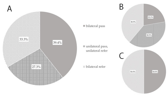 We were able to determine whether 38 of the 44 cases underwent NHS. Thirty-three of them underwent NHS and five did not. Among these 33 cases, NHS was performed by AOAE in six cases, by AABR in 18 cases, and by unknown methods in nine cases. Thirteen cases (39.4%) passed bilaterally, eleven cases (33.3%) did not pass bilaterally, and nine cases (27.3%) passed unilaterally (Figure 2A). For NHS performed by AABR, four cases (22.2%) passed bilaterally, seven cases (38.9%) did not pass bilaterally, and seven cases (38.9%) passed unilaterally (Figure 2B). For NHS performed by AOAE, three cases (50.0%) passed bilaterally, and three cases (50.0%) passed unilaterally (Figure 2C).