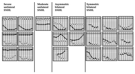 Figure 3 shows the audiograms of 21 patients who underwent pure-tone audiometry. Six cases had severe unilateral SNHL, one case had moderate unilateral SNHL, five cases had asymmetric bilateral SNHL, and nine cases had symmetric bilateral SNHL.