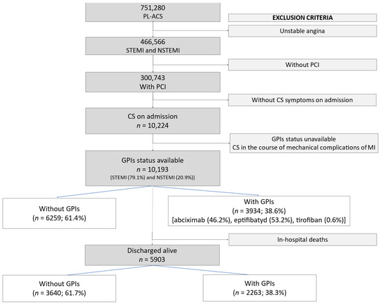 Study flow chart. CS—cardiogenic shock; GPIs—glycoprotein IIb/IIIa receptor inhibitors; MI—myocardial infarction; NSTEMI—non-ST-segment elevation myocardial infarction; PCI—percutaneous coronary intervention; PL-ACS—Polish Registry of Acute Coronary Syndromes; STEMI—ST-segment elevation myocardial infarction.