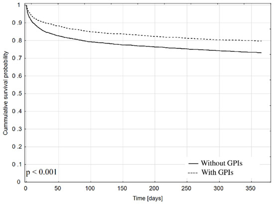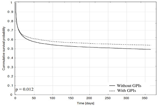 Kaplan–Meier curve showing cumulative survival probability in patients discharged alive depending on the in-hospital use of GPIs.
