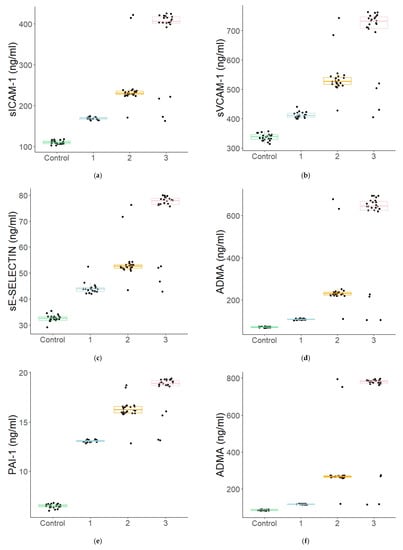 (a–g). A comparison of the distribution of selected parameters vs. DM1 duration. Boxplot of values for each subgroup. ((a)—the mean sICAM-1 values: 110.48 ± 4.53 vs. 168.47 ± 3.05 vs. 243.97 ± 55.18 vs. 372.85 ± 85.31 ng/mL; (b)—the mean sVCAM-1 values: 337.33 ± 11.73 vs. 412.56 ± 10.29 vs. 538.29 ± 59.77 vs. 687.26 ± 107.84 ng/mL; (c)—the mean sE-SELECTIN values: 5.43 ± 0.21 vs. 44.17 ± 2.27 vs. 54.01 ± 6.5 vs. 72.84 ± 11.56 ng/mL; (d)—the mean ADMA values: 71.91 ± 2.31 vs. 109.32 ± 2.38 vs. 261.05 ± 124.20 vs. 569.99 ± 193.44 ng/mL; (e)—the mean PAI-1 values: 6.51 ± 0.21 vs. 13.07 ± 0.11 vs. 16.29 ± 1.04 vs. 18.21 ± 1.84 ng/mL; (f)—the mean RAGE values: 84.94 ± 2.27 vs. 116.78 ± 1.53 vs. 301.95 ± 148.48 vs. 679.45 ± 230.59 pg/mL; and (g)—the mean CRP values: 0.8 ± 1.2 vs. 2.97 ± 4.53 vs. 2.78 ± 4.77 vs. 4.82 ± 7.92 mg/L). Legends: Control—control group; 1—the patients with newly diagnosed diabetes mellitus (DM1 duration < 1 year), n = 19; 2—the patients with DM1 duration of 1–5 years, n = 24; 3—the patients with DM1 duration of at least 5 years, n = 23.