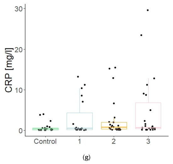 A positive, linear correlation was observed in the study group between the concentrations of the assayed endothelial damage markers and the disease duration. A significant increase in the concentrations of those markers was found already at very early stages of the disease, i.e., from the moment of its diagnosis, while the levels of C-reactive protein (CRP), the inflammation marker in the body, did not differ statistically significantly in relation to the control group (0.8 ± 1.2 vs. 2.97 ± 4.53 mg/L; p = 0.161) (see Figure 1a–g).