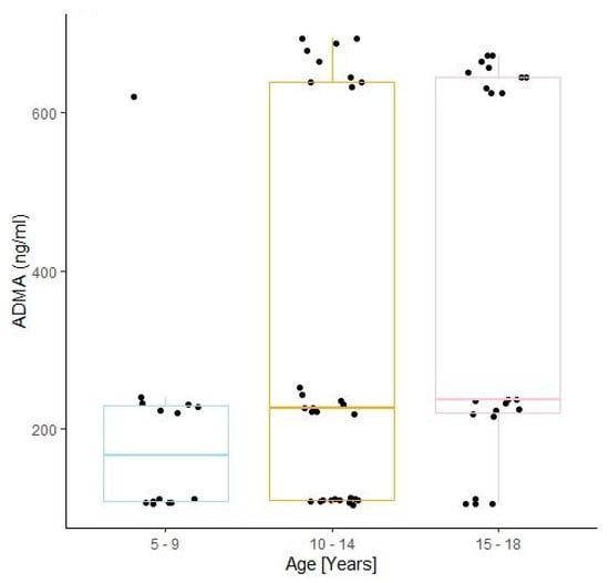 A comparison of the ADMA values depending on the patient’s age (196.99 ± 135.66 vs. 331.71 ± 246.17 vs. 397.40 ± 238.84 ng/mL). Boxplot of values for each subgroup. Legends: patients aged 5–9-years-old, n = 14; patients aged 10–14-years-old, n = 30; patients aged 15–18-years-old, n = 22.