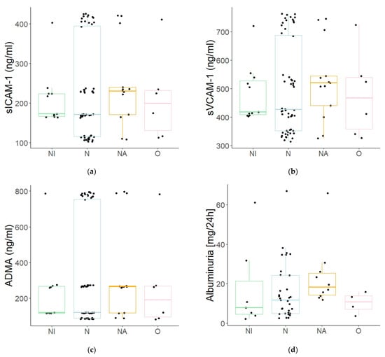 (a–d). A comparison of selected parameters depending on BMI ((a)—the mean sICAM-1 values: 209.94 ± 70.31 vs. 279.44 ± 108.54 vs. 269.65 ± 96.13 vs. 261.02 ± 103.28 ng/mL; (b)—the mean sVCAM-1 values: 481.18 ± 99.39 vs. 568.94 ± 141.01 vs. 560.93 ± 117.07 vs. 550.41 ± 129.89 ng/mL; (c)—the mean RAGE values: 231.46 ± 198.32 vs. 414.20 ± 298.22 vs. 380.62 ± 269.90 vs. 357.74 ± 291.02 pg/mL; (d)—the mean albuminuria values: 17.51 ± 21.68 vs. 15.81 ± 14.41 vs. 23.67 ± 16.08 vs. 10.23 ± 5.41 mg/24 h). Boxplot of values for each subgroup. Legends: NI—the patients underweight patients, n = 11; N—the patients with normal body weight, n = 39; NA—the overweight patients, n = 11; O—the patients with obesity, n = 4.