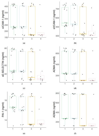 (a–f). A comparison of endothelial damage markers depending on the degree of metabolic (non)balancing of type 1 diabetes ((a)—the mean sICAM-1 values: 298.69 ± 95.06 vs. 284.13 ± 101.18 vs. 247.87 ± 114.65 vs. 207.70 ± 86.90 ng/mL; (b)—the mean sVCAM-1 values: 598.80 ± 111.06 vs. 583.04 ± 127.85 vs. 523.53 ± 152.63 vs. 461.07 ± 108.22 ng/mL; (c)—the mean sE-SELECTIN values: 62.13 ± 13.35 vs. 59.81 ± 13.58 vs. 55.57 ± 15.92 vs. 49.24 ± 12.07 ng/mL; (d)—the mean ADMA values: 397.44 ± 223.47 vs. 356.19 ± 228.50 vs. 284.21 ± 254.30 vs. 191.14 ± 188.38 ng/mL; (e)—the mean PAI-1 values: 17.23 ± 1.70 vs. 16.56 ± 2.12 vs. 15.08 ± 2.80 vs. 4.22 ± 2.07 ng/mL; (f)—the mean RAGE values: 462.95 ± 265.67 vs. 424.01 ± 281.86 vs. 333.59 ± 312.73 vs. 216.76 ± 231.39 pg/mL). Boxplot of values for each subgroup. Legends: 1—the patients with HbA1c: 6.5–8.9%, n = 20; 2—the patients with HbA1c: 9–11.4%, n = 17; 3—the patients with HbA1c: 11.5–13.9 %, n = 16; 4—the patients with HbA1c: ≥14%, n = 8.