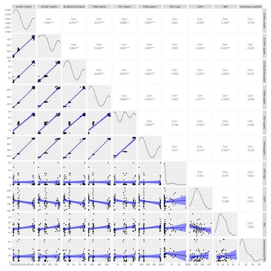 In addition, the in-house research results have allowed us to determine that children with diabetes mellitus and who are underweight present statistically significantly lower concentrations of sICAM, sVCAM-1, and RAGE when compared to children with a normal body weight. What is more, a linear correlation has been confirmed between the BMI values of the patients and the concentrations of these and other markers of endothelial dysfunction. Many publications also confirm such correlations [,,,,,]. On the other hand, the children who are overweight demonstrated significantly higher albuminuria vs. normal weight children, who had no linear correlation between the parameters. Moreover, positive correlations with BMI were found, both in terms of the patient’s age and the duration of the patient’s diabetes mellitus. Increased concentrations of endothelial dysfunction markers accompanied by increased BMI values may indicate the inflammatory state of the endothelium in the course of the developing metabolic syndrome (obesity as the risk factor of sclerosis). It could also be the case that the concomitance of these two conditions increases the risk of angiopathic complications, including diabetic kidney disease.