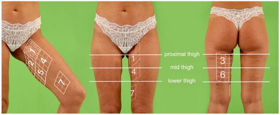 For each square, the pressure thresholds of slowly adapting fibers with Semmens Weinstein monofilaments were examined, as previously shown by Visconti et al. on the lower abdomen donor site in DIEP flap breast reconstruction [12]. A standard kit composed of five monofilaments (Baseline Tactile monofilament evaluators, Item: 12-1638, Fabrication Enterprises, White Plains, NY, USA) with increasing target force was used, as usually applied for testing pressure thresholds in the hands. Target forces of the Semmens Weinstein monofilaments were assigned to corresponding qualities of skin sensitivity. Examination of motoric thigh function included measurement of adduction strength and hip joint adduction and abduction mobility of both legs. The adduction strength was examined using the Medical Research Council’s scale for muscle strength ranging from M0 (no muscle movement) to M5 (full muscle strength against full resistance) [13]. Goniometric measurement using the neutral zero method was applied to examine hip joint adduction and abduction. The thigh circumference was measured on proximal thigh, mid-thigh and lower thigh to evaluate thigh symmetry, as shown in Figure 1. In the UL group, the circumference of the donor leg was set in relation to the circumference of the non-operated leg. In the BL group, the circumference of the smaller leg was set in comparison to the larger leg. In addition, the scar length and scar position to the groin were measured (quadrant 2, square b).