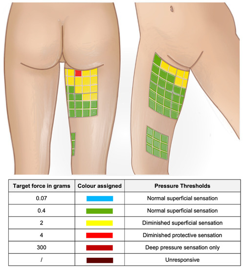 Skin sensation on the donor thigh. For each of the seven quadrants on the donor thigh, the average pressure thresholds have been examined and were categorized with colors, as indicated in the legend. According to the average pressure threshold, each square in the quadrant has been colored.
