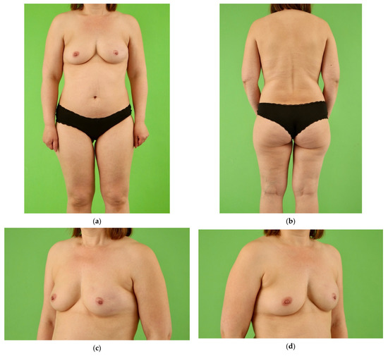 Normal-weight female patient (49 years, BMI 24.9 kg/m2) with invasive ductal carcinoma on the left breast in the medical history. Salvage reconstruction of the left breast with unilateral TMG flap from the right thigh following implant failure and skin-sparing mastectomy of the left breast. One refinement procedure of lipofilling from the abdomen was performed for volume boost-up the left breast combined with excision of the TMG skin island. In a second procedure, unilateral nipple reconstruction was conducted with nipple-sharing. Postoperative view at 6.0 year follow-up. (a) Front view with natural symmetry of the thighs after unilateral TMG flap harvest from the right thigh and concealed donor site scar in the groin of the right thigh. Excellent symmetry of both breasts following TMG flap reconstruction of the left breast and natural right breast; (b) Back view with natural symmetry of the thighs and concealed donor site scar in the natural crease of the right buttock; (c,d) Natural shape with volume symmetry of both moderate size breasts following unilateral TMG flap reconstruction of the left breast.