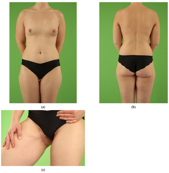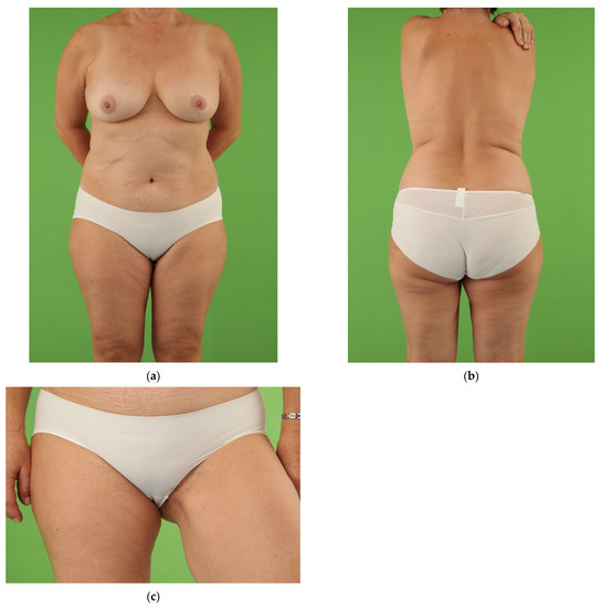 Overweight female patient (59 years, BMI 26.4 kg/m2) with invasive ductal carcinoma of the right breast and partial hepatectomy in the medical history. Salvage reconstruction of the right breast with TMG flap from the left thigh following implant failure after skin-sparing mastectomy and immediate silicone implant reconstruction. Breast reduction with vertical scar of the left breast for symmetrisation. Postoperative view at 5.0 year follow-up. (a) Front view with excellent shape and symmetry of both medium size breasts following TMG flap breast reconstruction of the right breast. Natural symmetry of the thighs after unilateral TMG flap harvest with secret scar in the groin of the left donor thigh; (b) Back view with secret scar in the natural crease of the left donor thigh; (c) Appealing contour of the left donor thigh with concealed scar in the groin.