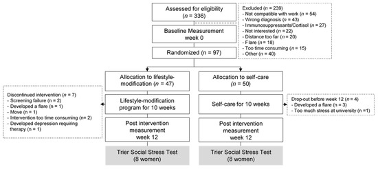 The present study presents long-term results of stress-related outcomes of a prospective RCT [25]. In addition, exploratory results of a sub-study applying a laboratory stress protocol conducted within the RCT are reported. The study was conducted at the Evang. Kliniken Essen-Mitte, Germany, between 2016 and 2019, approved by the Ethics Committee of the University of Duisburg-Essen (approval number 15-6554-BO), registered on clinicaltrials.gov (clinicaltrials.gov ID: NCT02721823, https://clinicaltrials.gov/ct2/show/NCT02721823 (accessed on 1 June 2021)) and performed according to the declaration of Helsinki, applying up-to-date good clinical practice standards. The previously published results report the effects of the comprehensive lifestyle-modification program on disease activity and quality of life [19]. The present manuscript aims to answer the question whether patients who had undergone the intervention program differed in their responses to stress from the patients who were in the control group. Various subjective stress questionnaires were collected before and after the intervention. Additionally, female patients from both groups voluntarily underwent the TSST shortly after the intervention group completed the program. Regarding the TSST, all patients were informed about the experiment and could choose whether they wanted to participate. Due to the different hormonal responses to stress between the sexes, only female patients were included in the TSST subsample. All patients gave written informed consent.