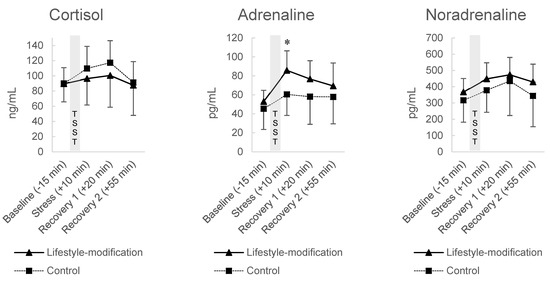 All measures within the TSST were assessed at four time points: Baseline (−15 min), Stress (+10 min), Recovery 1 (+20 min) and Recovery 2 (+55 min). State anxiety was assessed with the state version of the State-Trait Anxiety Inventory (STAI-S). The inventory includes 20 items that can be rated on a scale from 1 = not at all to 4 = very much so [34]. Blood pressure and pulse were assessed using a blood pressure monitor (Visocor OM50; UEBE Medical GmbH, Wertheim, Germany). Venous blood was collected in tubes containing EDTA (S-Monovette, Sarstedt, Nümbrecht, Germany). Complete blood counts including white blood cell differential were analyzed by the local clinical laboratory. Plasma was separated by centrifugation (2000× g, 10 min, 4 °C) and stored at −80 °C until analysis. Plasma levels of adrenocorticotropic hormone (ACTH) and cortisol were measured by enzyme-linked immunosorbent assay (ACTH and Cortisol ELISA, IBL International, Hamburg, Germany). The sensitivity of the assays was 1 pg/mL for ACTH and 5 ng/mL for CORT. Cross-reactivity of the anti-ACTH antibody with other peptide hormones was <0.001%, cross-reactivity of the anti-CORT antibody with other relevant steroids was 7.0% (11-deoxycortisol), 4.2% (cortisone), 1.4% (corticosterone), 0.35% (progesterone), and <0.01% (estrone, estradiol, estriol, testosterone). Plasma concentrations of adrenaline and noradrenaline were measured by ELISA (CatCombi, IBL International Germany) following affinity gel extraction, acylation, and enzymatic derivatization. The sensitivity of the assay was 8 pg/mL for adrenaline and 20 pg/mL for noradrenaline. Cross-reactivity of the antiserum with other catecholamines and their metabolites was <0.4%.