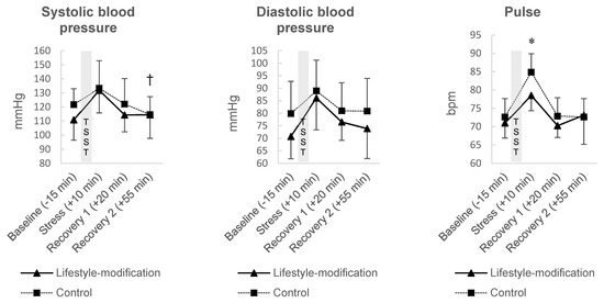 Results of the exploratory sub-study: Cardiovascular responses to the Trier Social Stress Test in the comprehensive lifestyle-modification group (n = 8) and controls (n = 8). Values expressed as mean ± standard deviation. mmHg = millimeter of mercury; bpm = beats per minute. * p < 0.05; † p < 0.10.