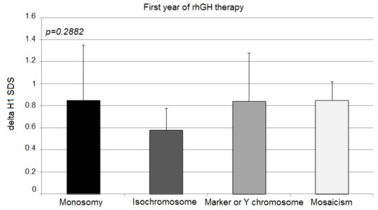 During the first year of the therapy, all groups responded well to the rhGH therapy, and there were no statistically significant differences in delta H1 SDS in the first year of rhGH therapy among groups: monosomy 0.85 ± 0.55 SD; isochromosome 0.58 ± 0.20 SD; marker chromosome 0.84 ± 0.44 SD; mosaicism 0.85 ± 0.17 SD; p = 0.2882) (Figure 1).