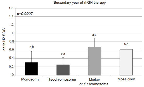 Growth response to rhGH during the second year of therapy. H2 SDS, height standard deviation score after 2 years of therapy; the ANOVA test was applied (p < 0.001). Values (bars) marked with the same letters are significantly different (Dunn’s multiple comparisons test): a—p < 0.04; b—p < 0.032; c—p < 0.015; d—p < 0.012. The groups designed with the same letter different significantly from each other: a—p = 0.040; b—p = 0.032; c—p = 0.015; d—p = 0.012.