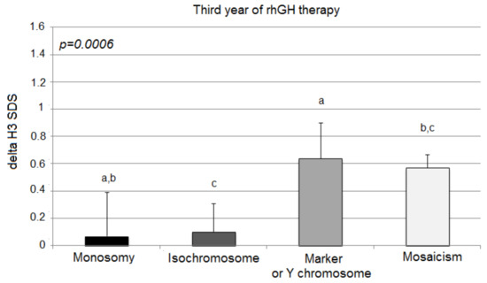 The third year of the therapy once again showed statistically significant differences in growth among the analyzed groups, expressed with delta H3 SDS (monosomy 0.07 ± 0.32; isochromosome 0.10 ± 0.21; marker chromosome 0.64 ± 0.26; mosaicism 0.57 ± 0.10; p = 0.0006) (Figure 3).